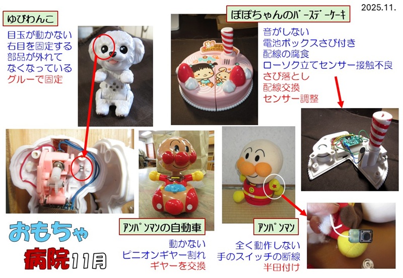 使わなくなったおもちゃが押し入れで寝ていませんか? 最寄りの開院場所(上記)にご相談下さい *おもちゃ病院で 修理用の部品として使います *使用可能なおもちゃは 点検後 こども関連施設に寄付します |