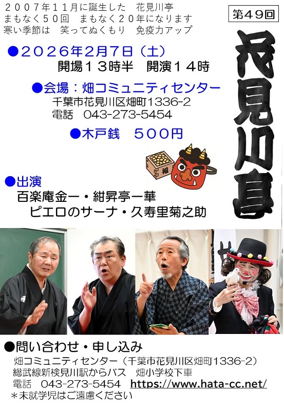日時 2026年2月7日(土)13時半開場 14時開演 場所 畑コミュニティセンター(千葉市花見川区) 木戸銭 500円 出演 百楽庵金一・紺昇亭一華・サーナ・久寿里菊之助 問合せ・申込み:畑CC 043-273-5454 |
