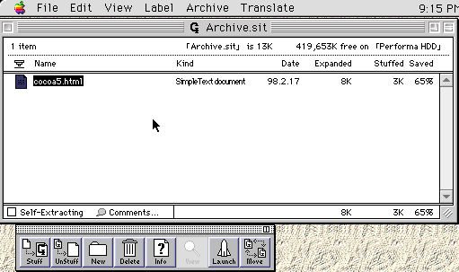 Aladdin Systemsが開発した圧縮形式。シェアウェアの『StuffIt Lite』、製品版の『StuffIt Deluxe』。Macintoshでは定番。