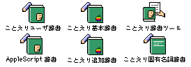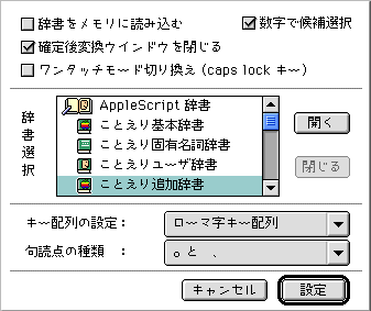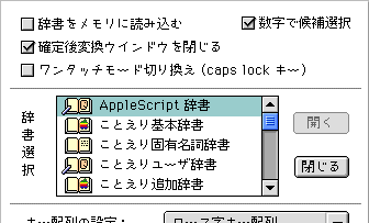 「ことえり固有名詞辞書」「ことえり追加辞書」「Finder辞書」「AppleScript辞書」と自分で辞書登録できる「ことえりユーザー辞書」が開いて、変換効率がアップします。 ついでに、ここの「環境設定」画面では、入力方法を「かな漢字変換」か「ローマ字かな漢字変換」に切り替えることも出来ますので、覚えておきましょうね。 ※このコーナーへのご意見、メールをお待ちしています。 |