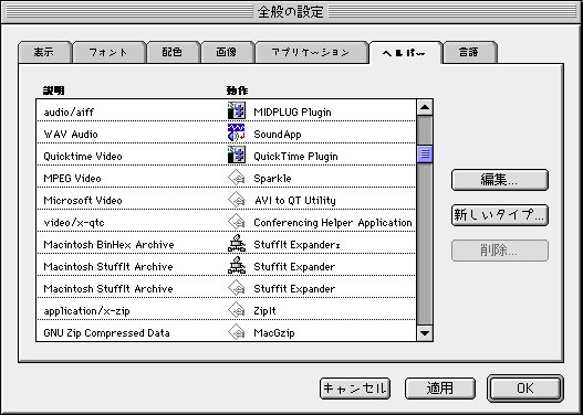 ネットスケープナビゲーターの『オプション』メニューから、『全般の設定』を選び、『ヘルパー』を開く。リストの中をクリックして、『編集』を選び、ソフト・プラグインを指定。設定したファイルを読み込むと、自動的にこのファイルが開きます。 ●Get and play ShockWave(ショックウエーブ) 米マクロメディア社のオーサリングソフト『ディレクター』のファイルを再生するためのプラグインです。 ShockWave Falash(ショックウエーブフラッシュ) 『マクロメディアフラッシュ』のデータを再生するためのプラグイン。データファイルの容量は小さいので、待ち時間が殆どないのと、データ転送が遅い回線でもスムーズに再生できるという特徴があります。