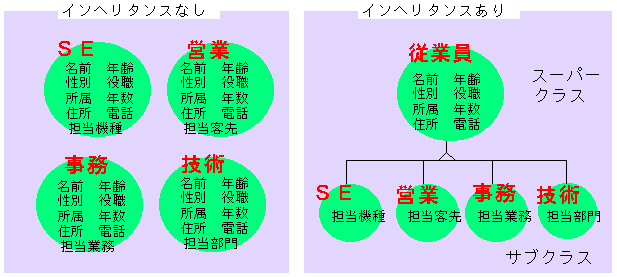 インヘリタンスを用いることによりコードの削減・間違いの減少・ オブジェクト関係の明確化・拡張に役立つ。なお継承されるクラスを スーパークラス、継承するクラスをサブクラスと呼ぶ。