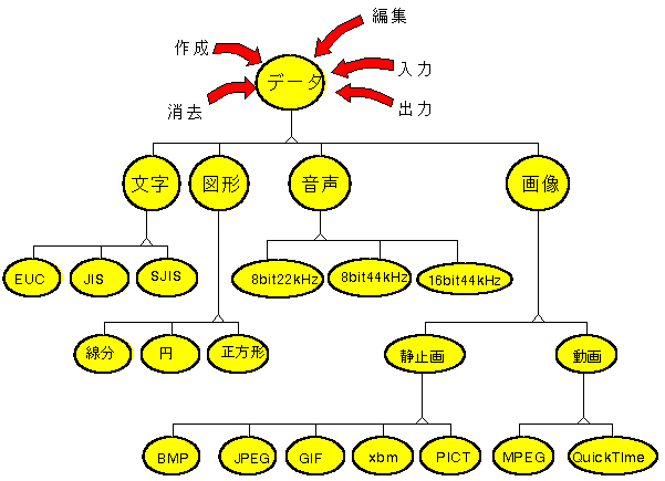 マルチメディアとは、文字・図形・写真・動画・音声といった各種メディアを コンピュータ上で統合して、各種のシミュレーションをおこなったり新たな創作環境を 提供したりするものである。このマルチメディアの制作環境においては、 オブジェクト指向の利点を遺憾なく発揮することができる。 1 データ・手続きの抽象化による実環境のシミュレーション 2 あらゆるメディアを、統一的に扱える 3 設計変更に強く・再利用に適している 4 メディア間の関連づけ(複合オブジェクト)も容易●WWWは、まさにハイパーテキストとマルチメディアの集大成です。