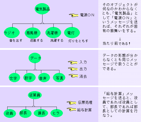 手続き名と手続き本体は実行時に結合されるので、複雑な条件式を考えなくともよい。 これをダイナミックバインディング(動的束縛)と呼ぶ。既存のコードに手を加えることなく、新たなクラスを作成したり内容を変更したり できるので、拡張性・柔軟性という点において非常に優れている。 例えば、新たにサブクラスが増えたときでも、システムの拡張はサブクラスに 関するものだけで済む。オーバーローディングと併用すると効果的である。