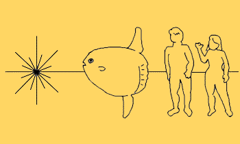 世界中の温帯/熱帯の海に棲むマンボウは、尾が退化して頭だけのような姿であることから、別名 Head Fishとも呼ばれている。(子供の頃はちゃんとした尾ヒレがある)![]() 英語ではSunFish。ちなみに「マン」は「円い」、「ボウ」は「魚」を意味する。 クラゲやプランクトンを食べ、大きなものは体長3m、体重1tを越すものもいる。 3億個もの卵を生むことでも有名。ちなみに食べられる。 (日本でも獲れるが、漁獲高は大変少ない) |