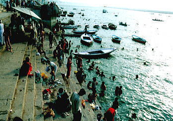 バラナシ! やっと辿り着いた。 3人でリキシャーに乗りメイン・ガートまで行く。 ガンジス河に向かって歩く。 気持ちがザワザワしてくる。 ひかりだ。 水だ。 おきく曲線を描き視界いっぱいに流れる、聖なる大河。 ずっと前から、ここに来ることが決まっていたような気がする。 やさしい風が吹いている。 たくさんの人が大河に浸かり祈りを捧げている。 崇高な巡礼地。 宗教世界の中心。 バラナシだ。 やっと着いた。