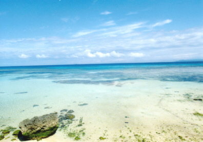 誰もいない広々としたエメラルドブルーの海が広がる。