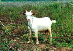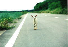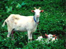 波照間島はヤギの多い島。 人間の姿を見るとすぐ逃げるのから 寄ってきて頭をすりつけるやつまで性質もいろいろ。 だいたい大人のヤギはビニールホースを首輪に つながれており、子ヤギは放し飼い。 山羊汁はこの地方のごちそう。