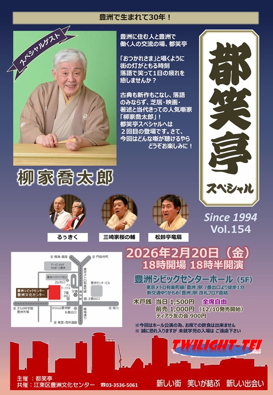 | 都笑亭の開催回数 | 都笑亭は年に五回 定期開催しています 2025年の開催予定日(変更になることもあります) Vol.149 2025年 2月21日(金) Vol.150 2025年 5月9日(金) Vol.151 2025年 7月25日(金) Vol.152 2025年 9月26日(金) Vol.153 2025年 12月5日(金) Vol.154 2026年 2月20日(金) |