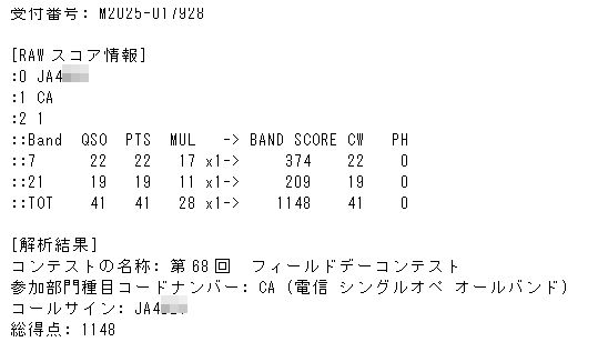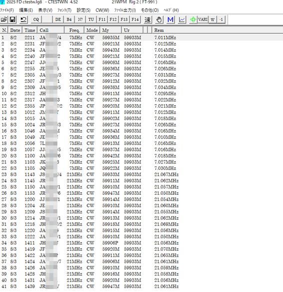 [2025 Field day Contest] にCWで参加しました。 このコンテストは8月2日(土)21:00 JST 〜 3日(日)15:00 JSTで行われました。 日曜日の午前中あたりがねらい目でしょうか。 日曜日に出かける予定が在ったりすると稼げませんが....。 HI 土曜日は21:00 からですから土曜日に用事を済ませておけ…という事か? 私もいつもの様に「参加することに重きを置いて」参加しました。HI いつもの様に今回もCW によるコンテスト参加です。(7MHz帯、 21MHz帯) あまり聴こえなかったようなので7、21以外は参加しませんでした。 「第68回 フィールドデーコンテスト規約です… 交信の結果および参加内容 (CWで41局です...)
