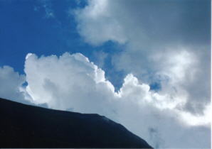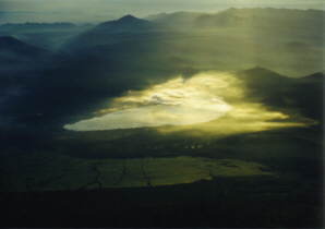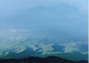 あたりの風景はどんどん色を取り戻してゆく。 登ってきた溶岩の道、樹海、山中湖、人間の暮らす街 連なる山並み、大陸を取り囲む海、海に浮かぶ島々 朝日に色を変えてゆく空と雲。 すべてを同時に見ることが出来る。 奥行きのある風景。 いつの間にか頭上には青空が広がる。 富士山のてっぺんから、でっかい空をつかんだ。