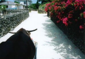 ブーゲンビリアやハイビスカスが白い道に映える。