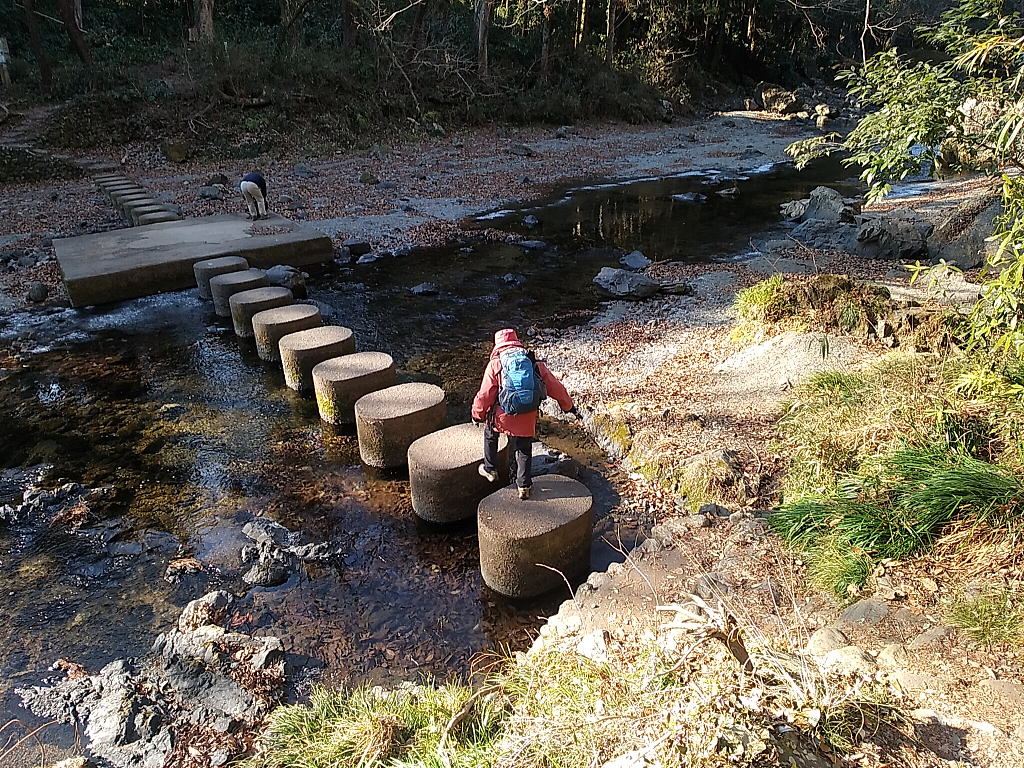 → 地理院地図の該当ページへ 近所の図書館で借りてきた「絶景低山コースガイド・関東周辺(山と渓谷社)」から、前回(1月5日)の新倉山に続いて、今回は埼玉県飯能市の市街地近く(奥武蔵の東端付近)に位置する低山・柏木山を歩くことにした。そのガイドブック(該当項の文:打田鍈一氏)のコース紹介によると、歩行距離6.9km、累積標高差470mの8の字型の周回コースとのことで、後期高齢者の今の私達には適していると思われた。そのサブタイトルの「…大展望の隠れ名山」に心惹かれたことも、動機の一つだ。 ★ 柏木山(かしわぎやま・303m): 別名はタカドッケ。多峯主山(とうのすやま・270m)、龍崖山(りゅうがいさん・246m)と合わせ「飯能三山」または「飯能三名山」と呼ばれることもあるようです。 飯能駅北口の2番乗り場から(1時間に3本程度出ている)国際興業バスに乗ると、10分足らずで永田大杉バス停に着く。気温は低いけれど快晴で、日が当たるとポカポカしてくる。分厚い上着を脱いで、歩き始めたのは9時45分頃だった。 まずは、自然のロケーションに優れた吾妻峡に下り、薄氷の浮かぶ入間川をドレミファ橋で渡る。このドレミファ橋には床板(橋桁)がなくて、橋脚のようなコンクリート製の飛び石を…ド・レ・ミ・ファ・ソ・ラ・シ・ドォ~と口ずさみながら…ポンポンと飛んで渡るようにできている。フィールドアスレチック的な、子供が喜びそうな、大人も楽しい、ワイルドで面白い「橋」だった。 “いきなりの渓谷風景”に感動してから再び舗装道へ出て、それから暫く進むと、10台程度でほぼ満車状態になっている「あかね尾根道コース入口駐車場(茜台駐車場)」が道路沿いにあった。このこじんまりとした駐車場の脇が柏木山の東の登山口になっていて、少し上ると近くの多峯主山(とうのすやま・270m)などが見渡せる展望地(茜台自然広場の一角)へ出て、ここでも小休止。 この茜台自然広場から四辻(柏木山方面)へ向かう一般登山道は、現地の案内板などによると3通りあるようだ。↓ ★ 茜台自然広場付近から四辻までの3コース ① ジャンダルム尾根コース(北コース): すごいネーミングですが、ごく普通の整備された尾根道であるらしいです。 ② あかね尾根ハイキングコース(ホタル谷コース): “谷”コースなのに“尾根”コースと呼ぶのかしら? ③ 百年ナラ尾根コース(南コース): ナラの古木が点在する深山ムードのコース。 私達夫婦はちょっと迷って、とりあえず道型のはっきりしている真ん中のコース(ホタル谷コース)を登ることにした。…リョウメンシダやベニシダなどのシダ類の緑が美しいホタル谷コースは、しかし30分足らずで登り切り、四辻で北コースと南コースに合流する。やがて赤根峠への道を左に分けて、右側のゴルフ場(飯能くすの樹CC)との境でもあるフェンス沿いに進み、「富士見の丘」と呼ばれる狭い角度の(富士山方面の)展望地でも小休止。それから20分ほどもなだらかに登り、冠毛をつけたコウヤボウキの目立つ箇所を過ぎると間もなく、約360度展望の柏木山の山頂に到着した。腕時計を見ると11時50分だった。 柏木山の小広い山頂部のあちこちには…奇特な方がいるもので…手作りのオブジェ(木工人形)が飾ってある。2~4人掛けのしゃれた木製のベンチとテーブルがいくつかあって、其々の席に数組のハイカーたちがくつろいでいる。たまたま山頂標石の傍らのベンチ(特等席だ!)が空いていたので、そこに腰掛けて、都心のビル群や…なんと、スカイツリーも見えている…丹沢や奥多摩の山々などの大展望を楽しみながら、まずペットボトルのお茶を口に含んでからおにぎりや鶏の唐揚げを食べたり、チョコレートを齧ったり、サーモスの熱いコーヒーを飲んだりして…至福のひとときを過ごした。 食後、例によって柏木山の山頂部をウロウロと歩いて、方位盤などを参照しながら、山座同定を楽しむ。丹沢山塊の右手(北側)に聳える大室山とそのさらに右手に聳える奥多摩の大岳山ははっきりと同定できたけれど、その2座の間に見えるはずの富士山は残念ながら雲の中だった。この日は、それがちょっと残念。 柏木山の山頂でまったりと時を過ごし、下山開始は12時40分、南へカモシカ新道を下る。指導標に従って登山道と林道を下り、約10台が停まれそうな駐車場(南側の柏木山登山口)を通り過ぎ、一軒家のある苅生(かろう)分岐を左折して、赤根峠の広場からも左折して、再び登山道をなだらかに登る。赤根峠は埼玉県の飯能と東京都の青梅を結んでいた峠跡、であるらしい。 やがて四辻へ出て、下りは「百年ナラ尾根コース(南コース)」を辿る。その尾根沿いは…文字通りコナラの古木が目立つ…天然林(二次林=つまり雑木林)だった。樹林の隙間からは里の風景や飯能の街並みなどが垣間見られ、それにも情緒がある。右前方(北~東面)に多峯主山(とうのすやま・270m)~天覧山197m~龍崖山(りゅうがいさん・246m)などの近くの山が大きく見え出して間もなく、振り出しの茜台自然広場の一角にド